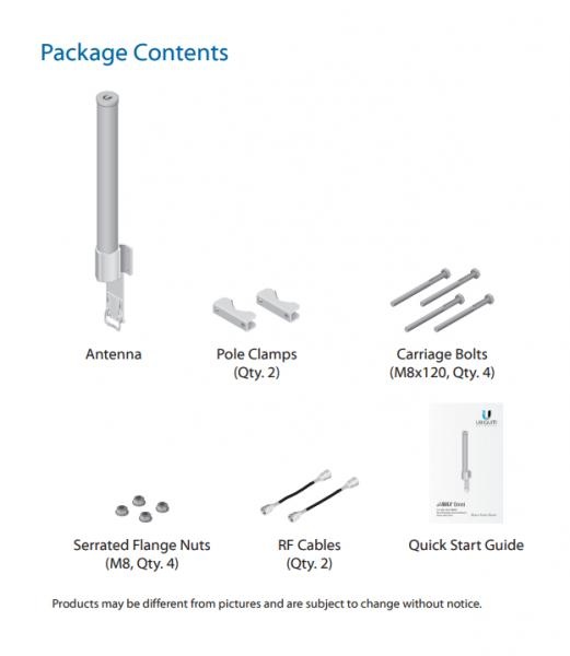 Antenna, Pole Clamps (2), Carriage Bolts (4), Serrated Flange Nuts (4), RF Cables (2), Quick Start Guide.