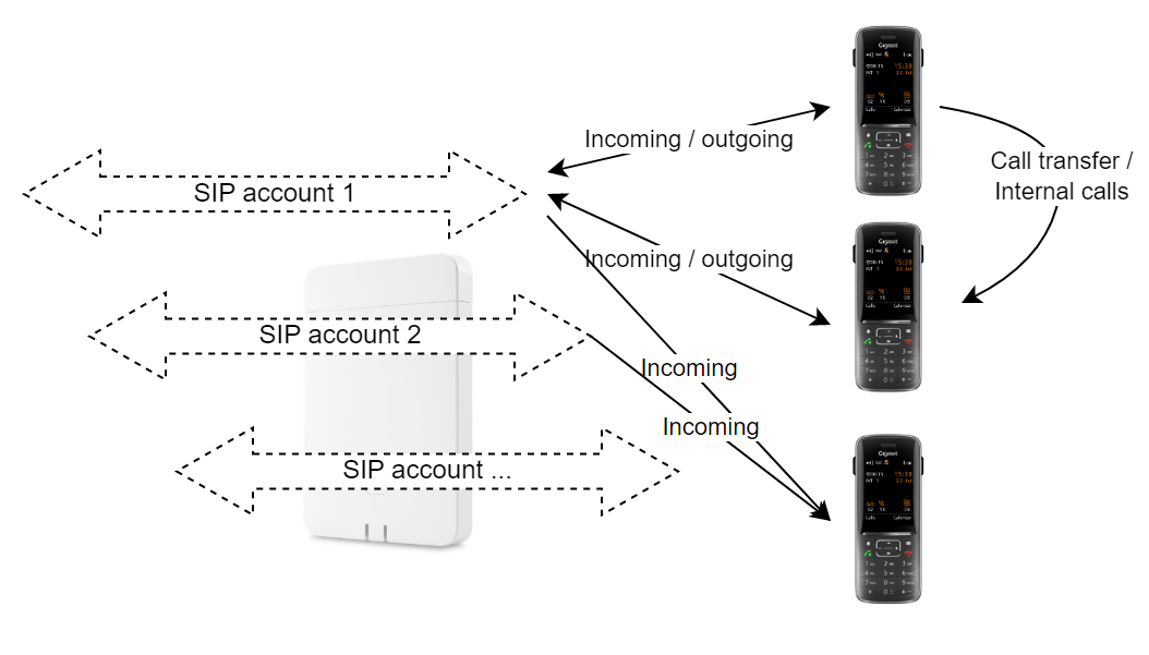 *vanaf versie 2.52.0 kan je met 1 sip account meerdere handsets overlaten gaan en ze kunnen onderling (intern) bellen zonder gebruik te maken van SIP accounts.