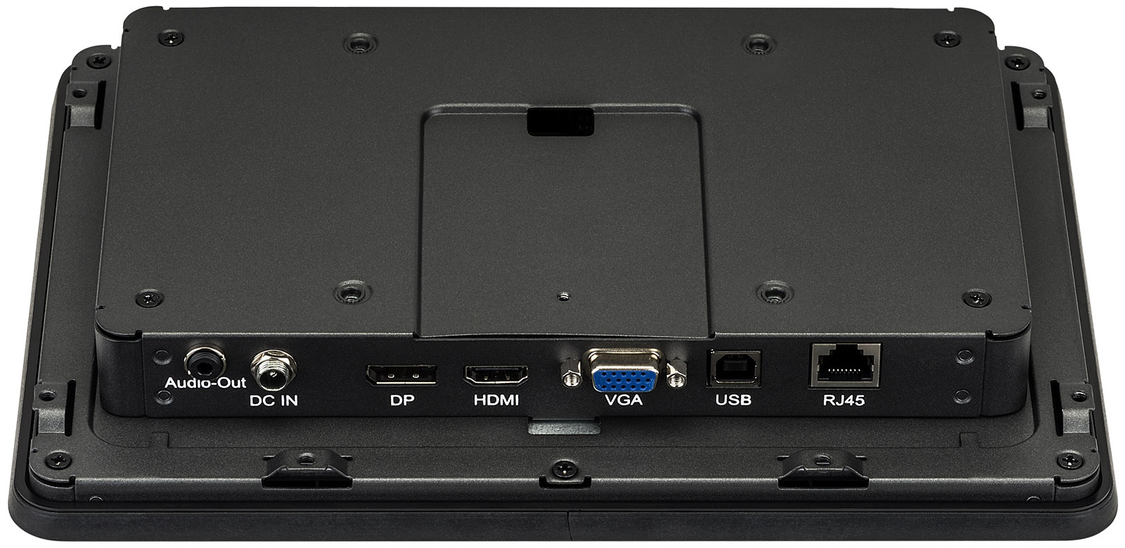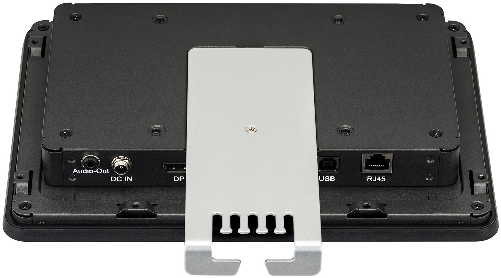 Aan de achterkant zitten VESA-montagegaten (100 x 100 mm). Hiermee kun je het scherm eenvoudig aan een muurbeugel of een eigen constructie bevestigen. Er zijn ook montagebeugels aan de zijkant voor inbouw.