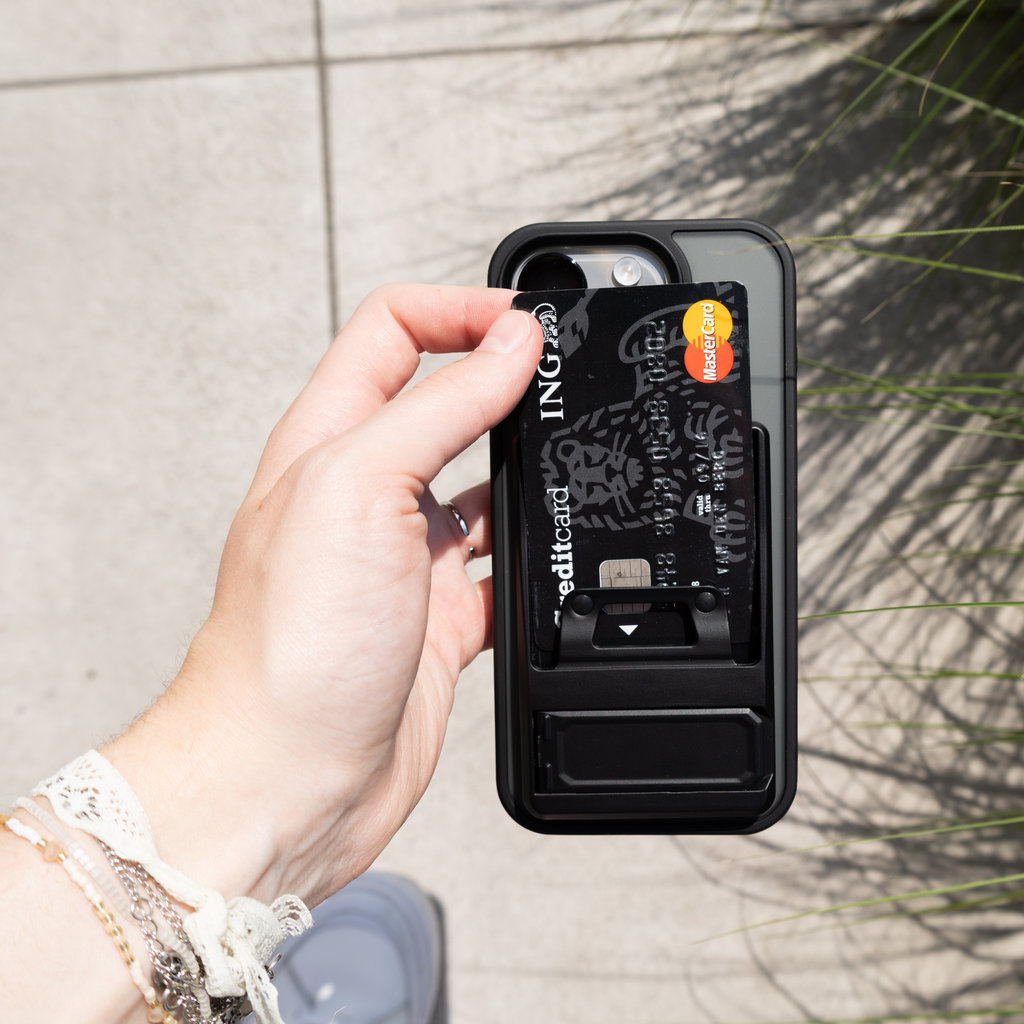 Deze vernieuwde kaarthouder combineert functionaliteit en design. De extra sterke MagSafe-magneten zorgen voor een stevige bevestiging, zelfs bij intensief gebruik. De geïntegreerde klikstandaard klapt soepel uit en blijft stabiel staan – ideaal voor video’s of handsfree gebruik op je bureau of nachtkastje. Ruimte voor twee pasjes maakt hem een slim alternatief voor je portemonnee.