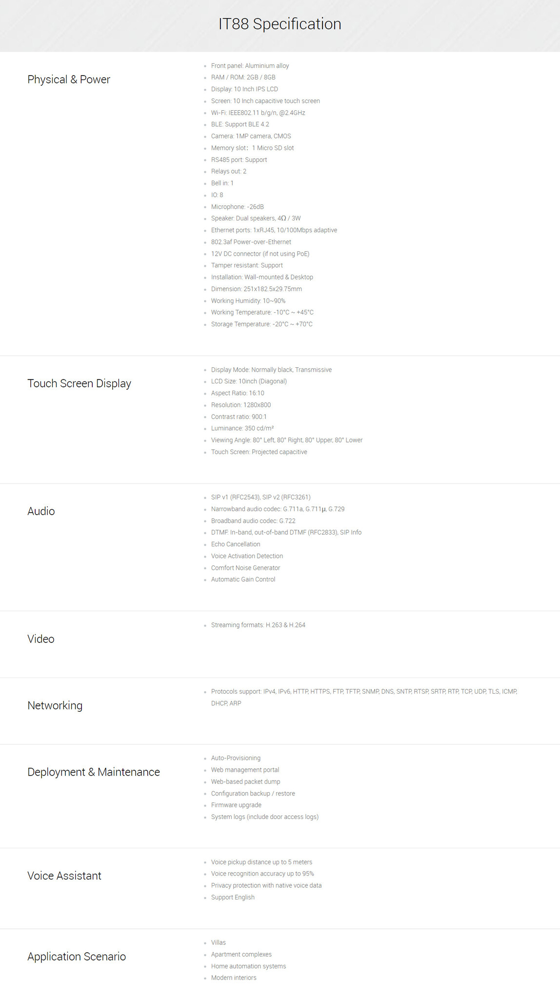 Kies voor de Akuvox IT88S als u op zoek bent naar een geavanceerde, alles-in-één intercom- en Smart Home-bedieningsoplossing. Dankzij de ingebouwde spraakherkenning bedient u moeiteloos deuren of muziek, zonder dat u het scherm hoeft aan te raken. De combinatie van een groot, helder 10 inch display, ruime connectiviteitsopties (zoals RS485 en een Micro SD-sleuf) en een strakke inbouwafwerking maakt dit de ideale keuze voor een comfortabel, veilig en modern huis.