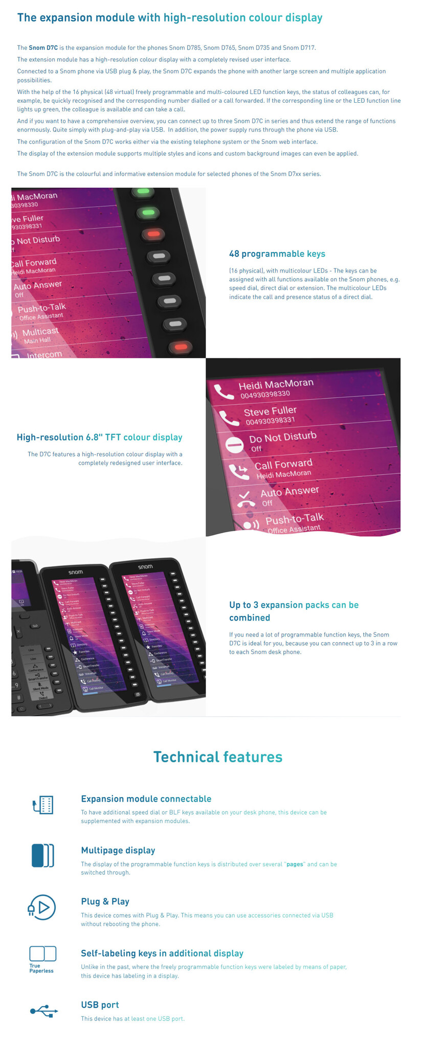 De Snom D7C is een geavanceerde kleur-expansiemodule ontworpen voor geselecteerde Snom D7xx-serie bureautelefoons. Met deze module breidt u de functionaliteit van uw telefoon aanzienlijk uit, waardoor u direct inzicht heeft in de beschikbaarheid van collega's en snel veelgebruikte functies kunt bedienen.