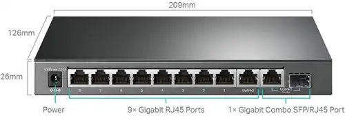 - Totaal 10 poorten: 9x Gigabit RJ45 en 1x Gigabit Combo (SFP/RJ45).