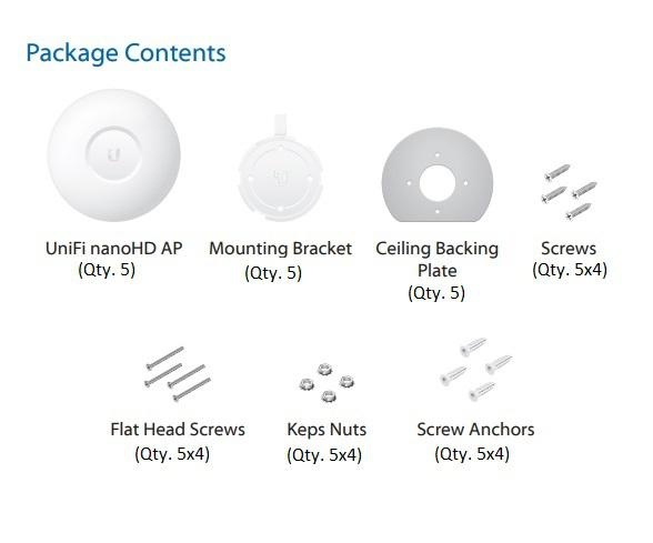 UniFi nanoHD AP (5), Mounting Bracket (5), Ceiling Backing Plate (5), Screws (5x4), Flat Head Screws (5x4), Keps Nuts (5x4), Screw Anchors (5x4).