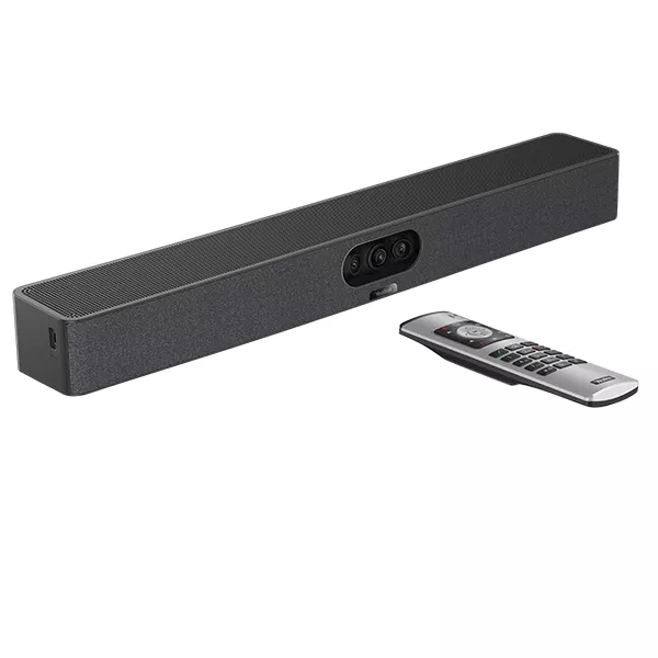 De Yealink MeetingBar A25-010 biedt de perfecte oplossing voor videovergaderen in kleine ruimtes. Dankzij de extreem brede kijkhoek van 151° (HFOV) hoeft niemand meer ongemakkelijk naar achteren te leunen om in beeld te komen. Dit model combineert drie krachtige 4K-camera's, een 8-microfoon array en een luidspreker in één compacte behuizing. De meegeleverde VCR11 afstandsbediening maakt het bedienen van de camera en het gesprek eenvoudig en intuïtief, zonder dat er een extra touch panel op tafel nodig is.